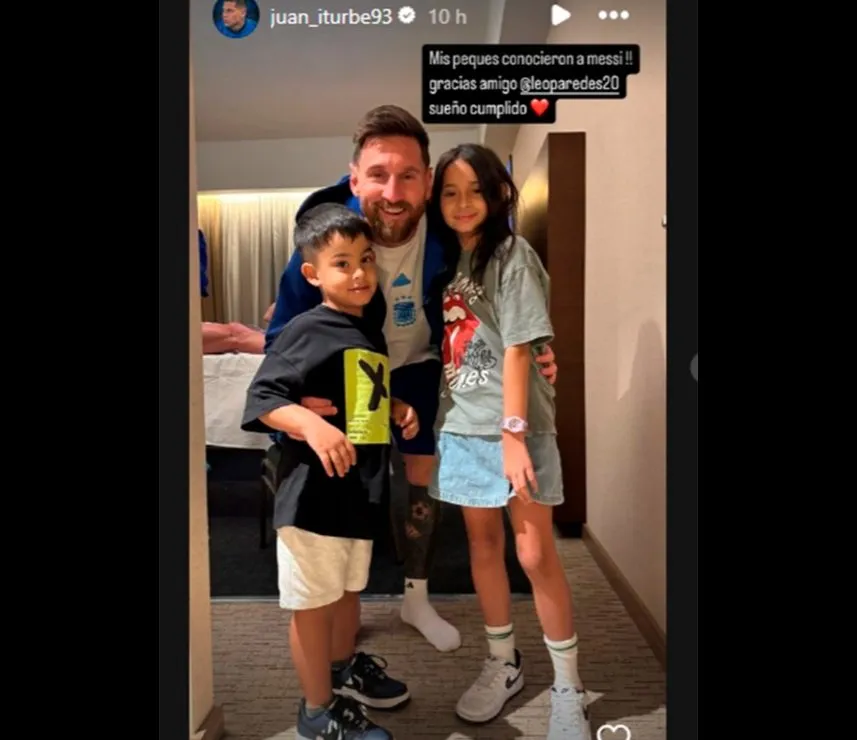 “Mis peques conocieron a Messi. Gracias Leo Paredes por hacerlo posible. Sueño cumplido”, escribió Iturbe para acompañar una foto que subió en una historia de Instagram, del capitán argentina junto a sus dos niños. Luego subió una foto suya con Paredes, diciéndose feliz por el reencuentro, y una más que le fue tomada a él mismo mientras sacaba la foto de sus hijos con La Pulga.