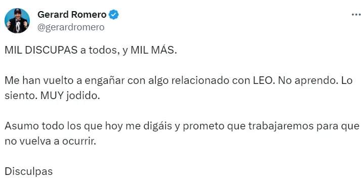 No pasaron ni 20 minutos para que el periodista pidiera perdón por la mala información. “Mil disculpas a todos, y mil más. Me han vuelto a engañar con algo relacionado con Leo. No aprendo. Lo siento. Muy jodido”, soltó en su cuenta de Twitter.