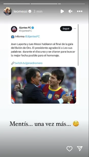 “Mentís, una vez más”, soltó el mejor jugador del mundo en una historia de Instagram, apuntando contra Gerard Romero. El capitán de la Selección Argentina no tiene buena relación con el periodista y lo dejó en claro en sus redes sociales.
