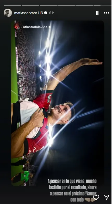 “A pensar en lo que viene. Mucho fastidio por el resultado, ahora a pensar en el próximo partido. Vamos con todo“, expresó Cóccaro en una historia subida a Instagram. Minutos antes, había compartido el momento donde Messi lo abraza y le regala su camiseta.