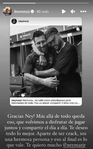Acompañado por una foto de los dos cracks abrazados, Lionel Messi respondió a dicha dedicatoria en sus historias: “Gracias Ney, más allá de todo lo que queda es eso. Que volvimos a disfrutar de jugar juntos y de compartir el día a día”, soltó el argentino.