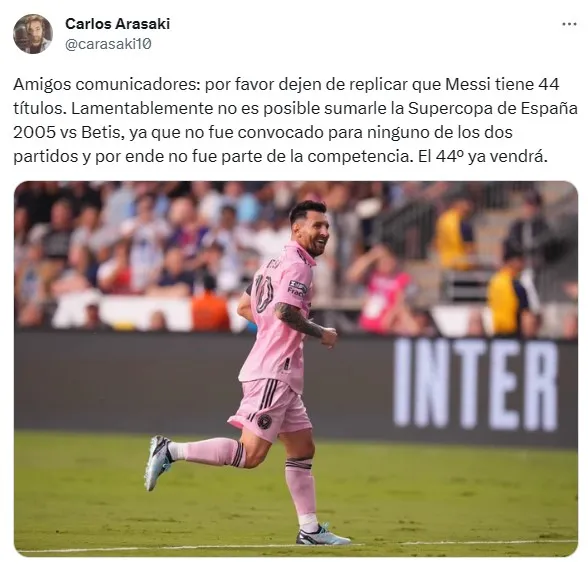Esta postura fue impulsada por el periodista Carlos Arasaki en redes sociales, que se remontó hasta los inicios de la carrera de Messi como profesional para alegar que, en realidad, se le está contabilizando un título extra al “10” pese a no haber participado de la competición en cuestión.