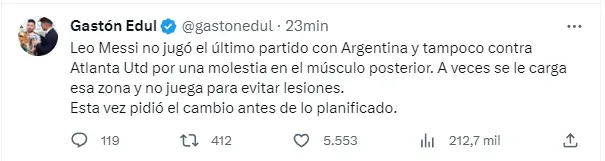Posteriormente, Gastón Edul, periodista que sigue día a día la actualidad de la Selección Argentina, indicó que Messi no jugó ante Bolivia ni contra Atlanta United por una molestia en el músculo posterior. En algunas ocasiones el mismo se carga y no juega para evitar lesiones. Por eso pidió el cambio.