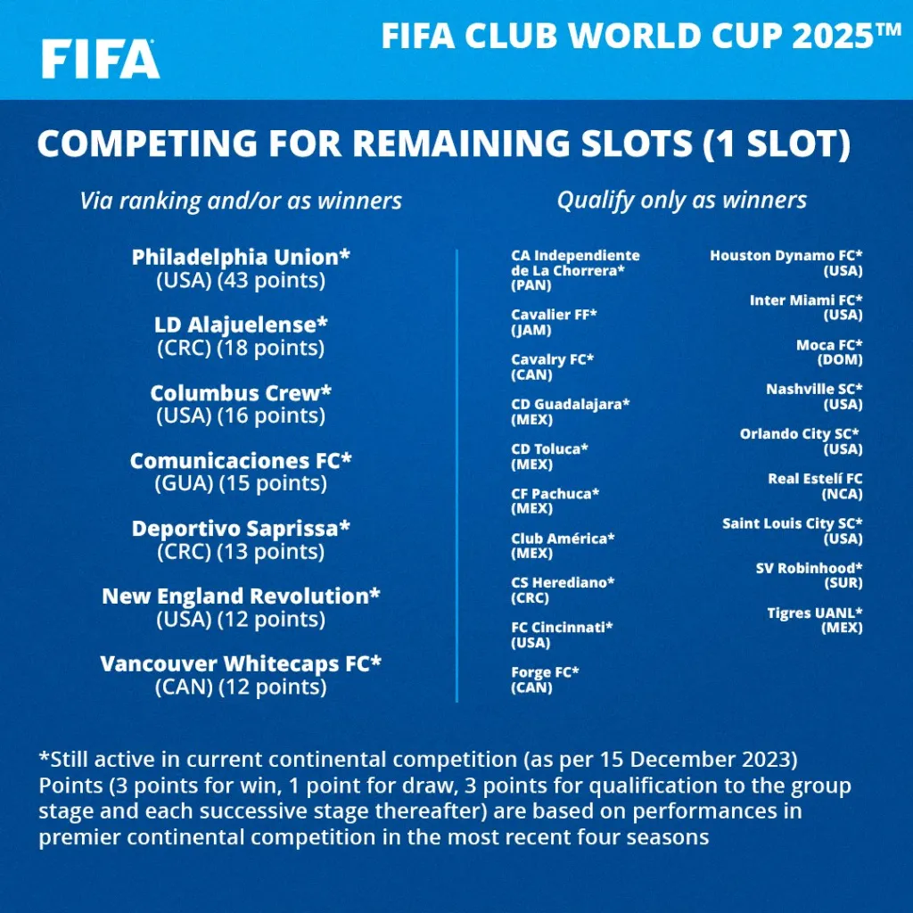 Hasta el momento, ya están dentro del Súper Mundial de Clubes Monterrey (MEX), campeón de la Champions Cup 2021; Seattle Sounders (USA), campeón de la edición 2022; y Club León (MEX), ganador de la del 2023. Solo queda la plaza del 2024.