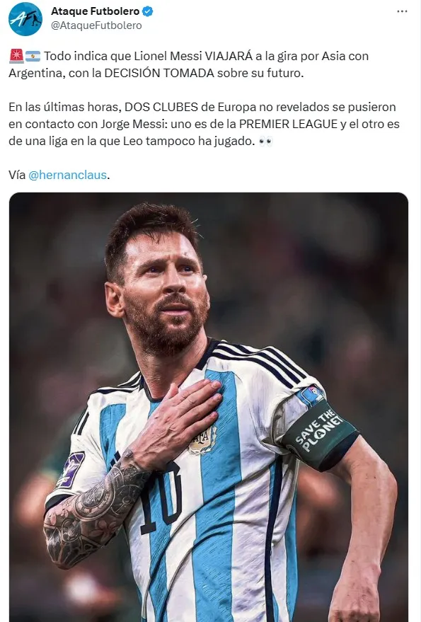 El periodista Hernán Claus dio a conocer que “dos clubes de Europa no revelados se pusieron en contacto con Jorge Messi“; uno sería de la Premier League y otro de “una liga en la que Leo no ha jugado”, una pista que abre el abanico con dirección a Italia o Alemania. Serán semanas de muchos rumores hasta que el campeón del mundo con la Albiceleste tome su decisión final.