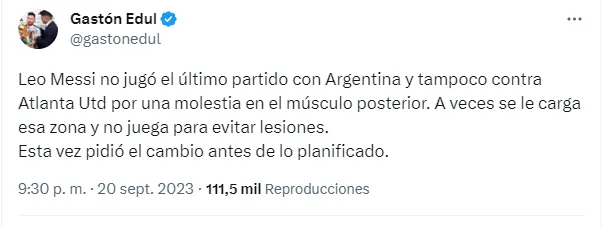 En su cuenta de Twitter, el periodista Gastón Edul informó al respecto: “Leo Messi no jugó el último partido con Argentina y tampoco contra Atlanta Utd por una molestia en el músculo posterior. A veces se le carga esa zona y no juega para evitar lesiones. Esta vez pidió el cambio antes de lo planificado”.