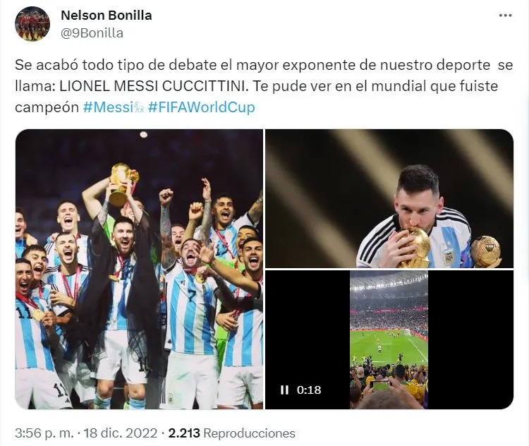“Se acabó todo tipo de debate, el mayor exponente de nuestro deporte se llama: LIONEL ANDRES MESSI CUCCITTINI. Te puede ver en el Mundial que fuiste campeón”. Fue un hincha más. Viajó a Qatar, llegó al estadio, cantó todas las canciones del repertorio y celebró la victoria, con camiseta Argentina y todo. Nelson Bonilla cumplió el sueño de ver al crack en cancha.