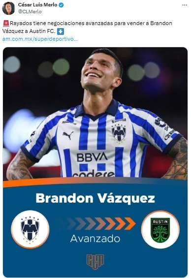 Se trata de Brandon Vázquez, el futbolista de la Selección de Estados Unidos que milita ahora en el Monterrey de Martín Demichelis. Según la información de César Luis Merlo, los clubes están en negociaciones avanzadas para que el delantero regrese a su país natal.