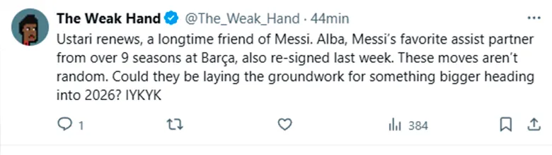 Otro aficionado, en cambio, eligió ilusionarse con la posibilidad de que se esté allanando el camino para la continuidad del capitán: “Ustari, amigo de Messi desde hace mucho tiempo, renueva. Alba, el asistente favorito de Messi durante más de nueve temporadas en el Barça, también renovó la semana pasada. Estos movimientos no son casuales. ¿Podrían estar sentando las bases para algo más grande de cara a 2026?”, escribió.