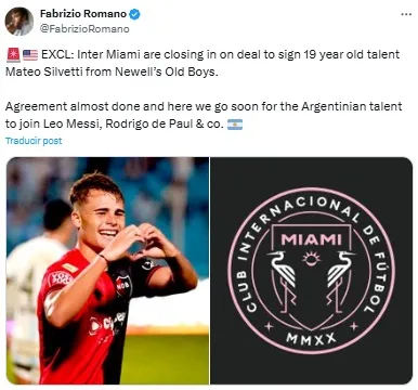 Desde entonces se especuló con un futuro arribo de Silvetti a Inter Miami y, aunque Newell’s presionó para mantenerlo en el equipo hasta diciembre, su salida de habría acelerado según el periodista italiano. Restan detalles para que el atacante viaje y se una a sus nuevos compañeros.