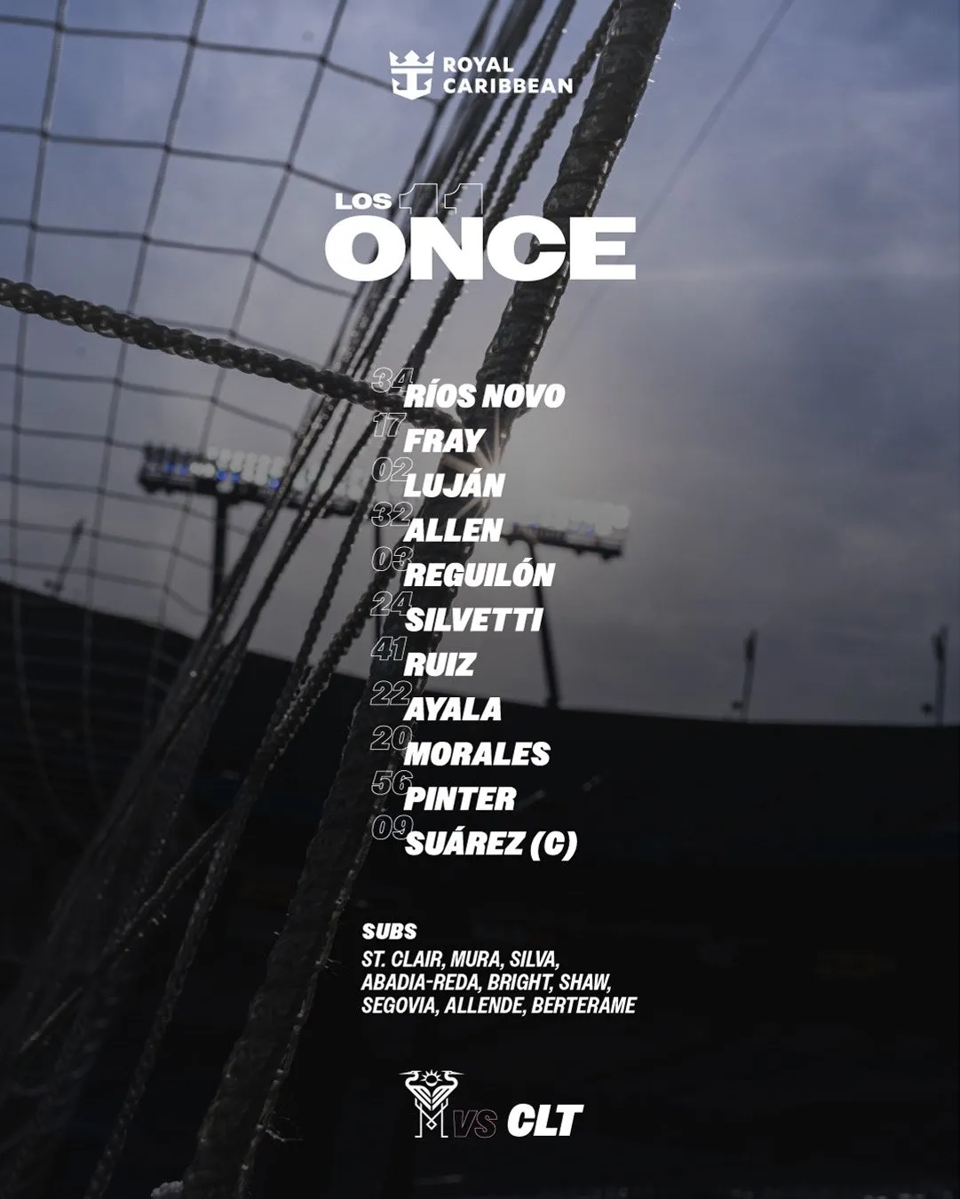 Javier Mascherano decidió que quienes integren el once titular ante Charlotte sean Rocco Ríos Novo, Ian Fray, Gonzalo Luján, Noha Allen, Sergio Reguilón, Mateo Silvetti, David Ruíz, David Ayala, Santiago Morales, Daniel Pinter y Luis Suárez, quien lucirá la cinta de capitán.