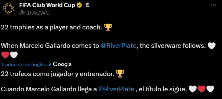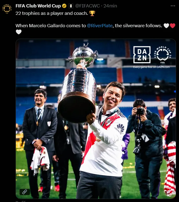 Este viernes, la cuenta oficial del Mundial de Clubes compartió una publicación para destacar a River, uno de los seis clubes de Sudamérica que dirán presente en Estados Unidos. En la misma el foco estuvo puesto en Marcelo Gallardo y su éxito en el Millonario, tanto en su etapa de jugador como de entrenador.
