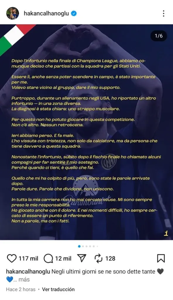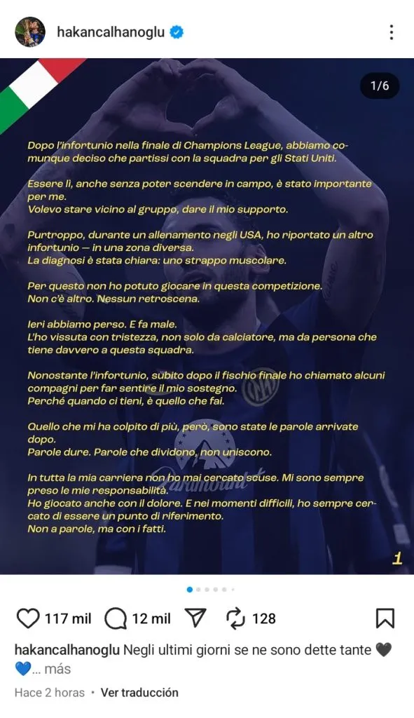 “Respeto todas las opiniones, incluso la de un compañero, incluso la del presidente. Pero el respeto no puede ser unilateral. Siempre lo he demostrado, dentro y fuera del campo. Nunca he traicionado esta camiseta. Nunca he dicho que no fuera feliz en el Inter”, se manifestó Calhanoglu a través de un comunicado que compartió este martes en su cuenta de Instagram.