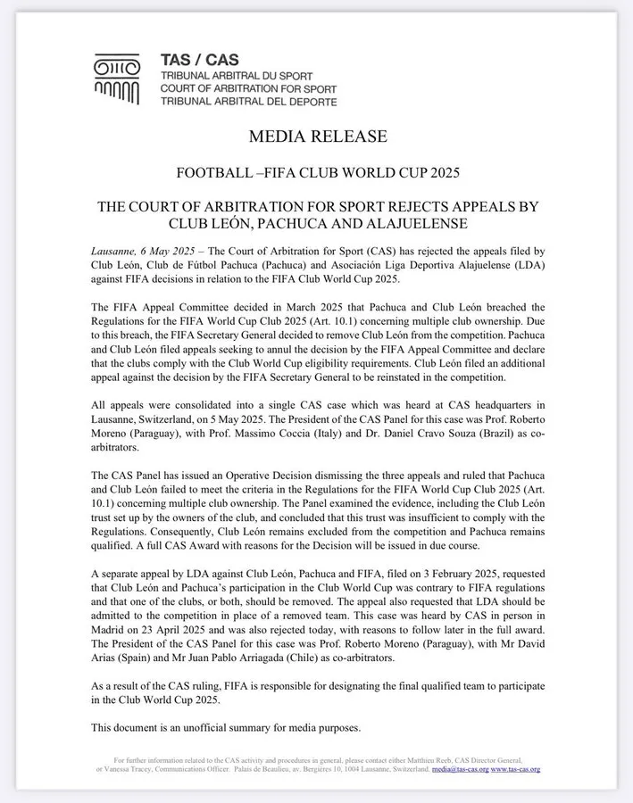 Luego de que el equipo mexicano acudiera al TAS para argumentar sus motivos para participar del Mundial de Clubes 2025, este martes -a poco más de cinco semanas para el inicio del torneo- salió el fallo del Tribunal y en el mismo se confirmó que finalmente León no será parte de la contienda.