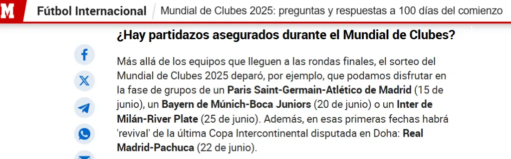 El más saliente para la mirada europea será el París Saint-Germain vs. Atlético de Madrid del 15 de junio en el Rose Bowl de Los Angeles por la primera jornada del Grupo B. Y pegado al cruce entre galos y colchoneros ubican, por un lado, al Boca vs. Bayern Munich del 20 de junio en el Hard Rock Stadium de Miami por la jornada 2 del Grupo B y, por el otro, al River vs. Inter de Milán del 25 del mismo mes en el Lumen Filed de Seattle por el cierre del Grupo E.