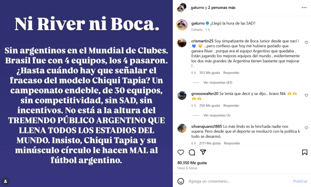 A través de Instagram, Milei y Nik compartieron: “Ni River ni Boca. Sin argentinos en el Mundial de Clubes. Brasil fue con 4 equipos, los 4 pasaron. ¿Hasta cuándo hay que señalar el fracaso del modelo del Chiqui Tapia? Un campeonato endeble, con 30 equipos, sin competitividad, sin SAD, sin incentivos. No está a la altura del TREMENDO PÚBLICO ARGENTINO QUE LLENA TODOS LOS ESTADIOS DEL MUNDO. Insisto, Chiqui Tapia y su minúsculo círculo le hacen MAL al fútbol argentino”.