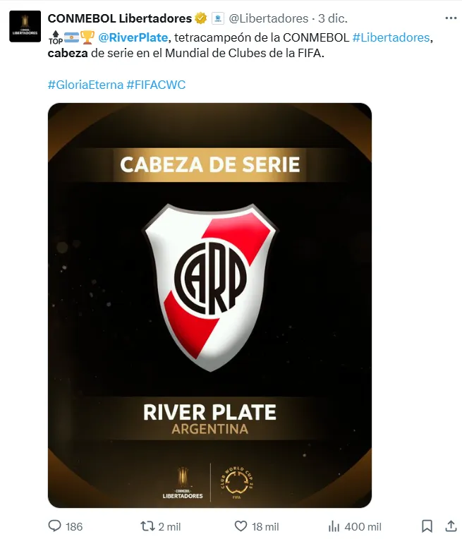 “River Plate, tetracampeón de la Copa Libertadores, cabeza de serie en el Mundial de Clubes de la FIFA” escribió la cuenta oficial de la casa madre del fútbol sudamericano. Algo similar hizo con Flamengo, Palmeiras y Fluminense, los otros tres de este continente que ocupan ese bombo.