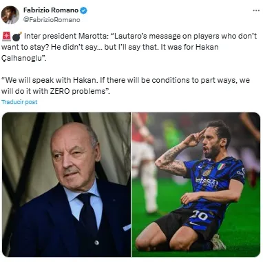 “¿El mensaje de Lautaro sobre los jugadores que no quieren quedarse? No lo dijo… pero lo diré. Fue para Hakan Çalhanoglu”, soltó el mandatario del club italiano en relación al mediocampista turco.