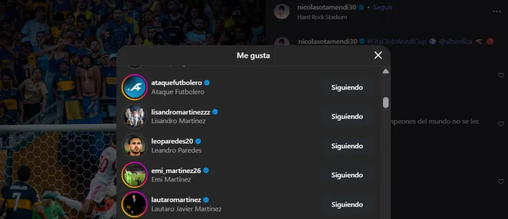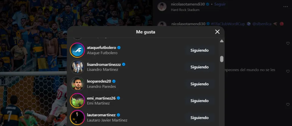 La publicación de Nicolás Otamendi recibió casi 600 mil Me Gusta, entre los que se destacan varios compañeros de la Selección Argentina, entre ellos Gonzalo Montiel, Lisandro Martínez, Dibu Martínez, Lautaro Martínez y también Leandro Paredes, quien es confeso hincha de Boca y el club de La Ribera negocia con él para tenerlo en este mercado de pases.