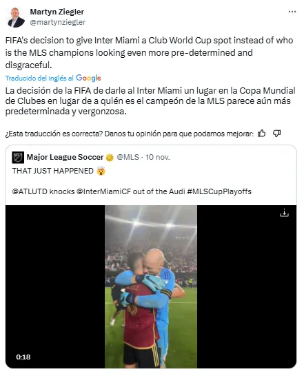 El autor de este artículo, el periodista Martyn Ziegler, amplió su postura a través de su cuenta de X (ex Twitter) y no tuvo filtros para opinar al respecto. “La decisión de la FIFA de darle al Inter Miami un lugar en el Mundial de Clubes en lugar del campeón de la MLS parece aún más predeterminada y vergonzosa”, posteó.