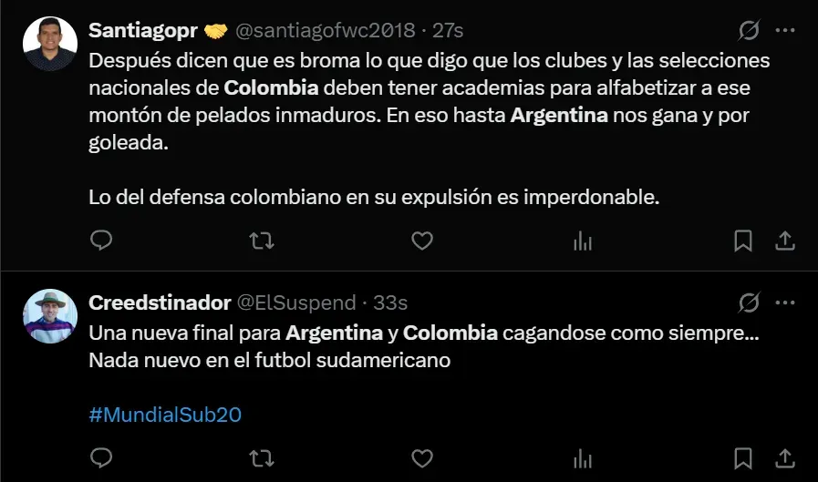 Mateo Silvetti anotó el gol argentino para lograr la clasificación, quien tuvo una gran actuación tras su ingreso por Ian Subiabre en el entretiempo. Pero más allá de lo deportivo, aparecieron las chicanas de siempre en las redes sociales, donde todo comenzó a partir de la expulsión que sufrió Jhon Rentería.