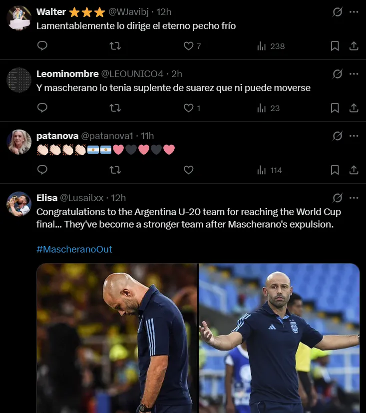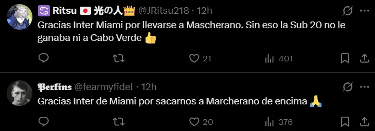 “Gracias Inter Miami por llevarse a Mascherano. Sin eso la Sub 20 no le ganaba ni a Cabo Verde”, comentó uno de ellos. “Gracias por sacarnos a Mascherano de encima”, escribió otro. “Se convirtieron en un equipo más fuerte después de la salida de Mascherano”, señaló un tercero. “Lamentablemente los dirige el eterno pecho frío”, arremetió uno más.