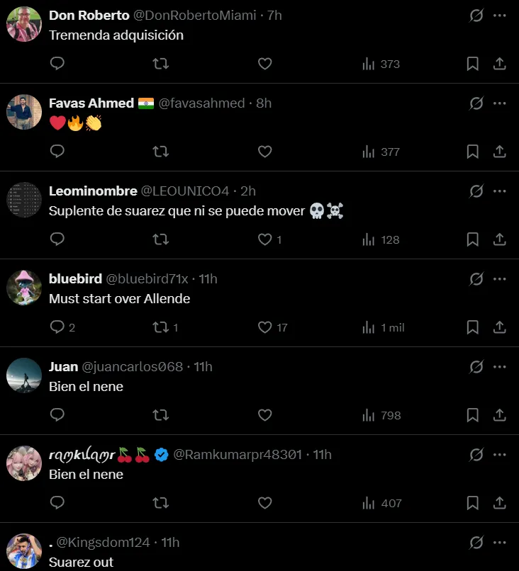 “Él debería ser nuestro delantero en los playoffs de la MLS, no Suárez”, sugirió uno. “Luego regresará para sentarse en el banco por un jugador que está terminado”, ironizó otro. “Pero Mascherano pone de titular a Suárez y Allende”, remarcó un tercero. “Suplente de Suárez que ni se puede mover”, hizo notar uno más.