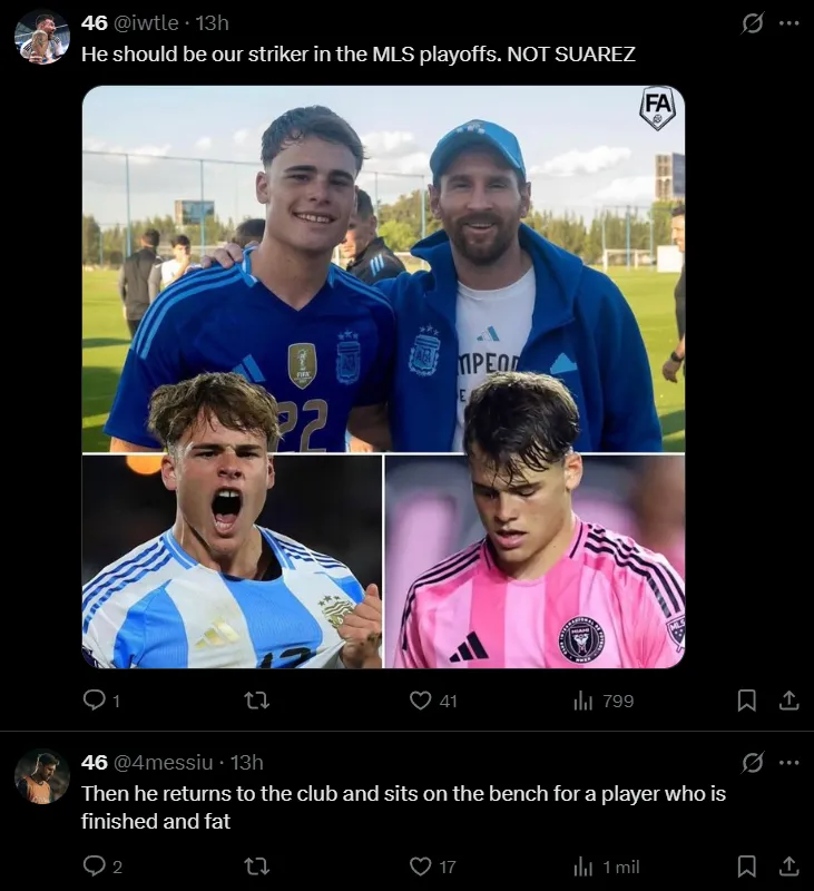 Entre los fanáticos de Inter Miami, el grueso de los comentarios se orientó al pedido de titularidad para Mateo Silvetti, quien solo participó de tres partidos y completó un total de 96 minutos desde su llegada al club procedente de Newell’s.