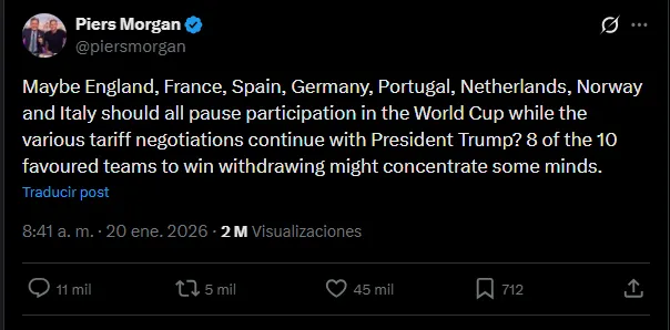 - Piers Morgan instó a 8 países europeos a pausar su presencia en el Mundial 2026.
