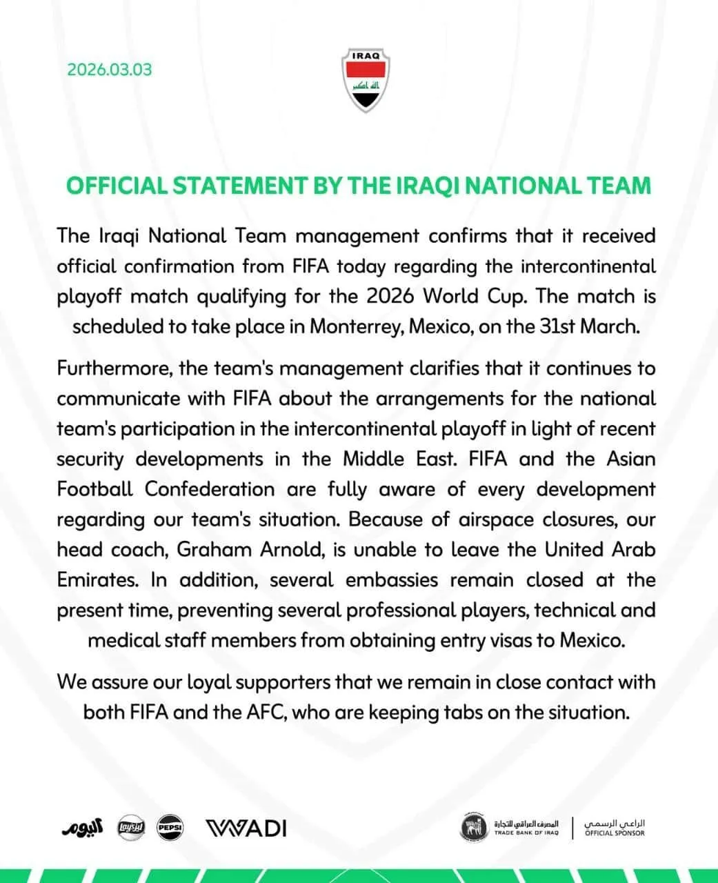- Irak enfrentará al ganador de Bolivia y Surinam el 31 de marzo en México pero está teniendo problemas para viajar.
