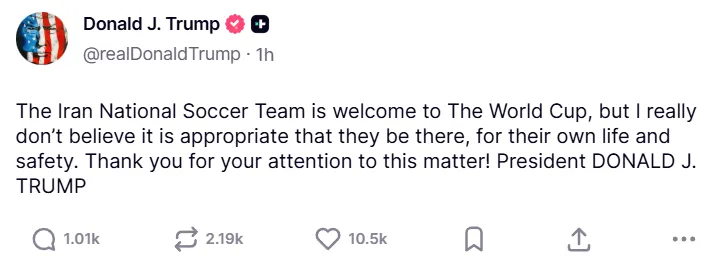 Un día después que el ministro de Deportes de Irán comunicara que no estaban dadas las condiciones para que la Selección participara del Mundial haciendo referencia al “gobierno corrupto” de los Estados Unidos que “ha asesinado” a su Líder Supremo Alí Jamenei, el propio Donald Trump salió a dar una respuesta a través de su red social Truth.