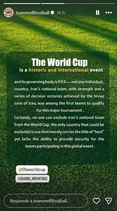 Sin que exista ninguna comunicación formal con FIFA para confirmar su baja de la competencia, porque no es el ministro de Deportes Ahmad Donyamali sino la Federación de Fútbol quien tiene esa potestad, desde la Selección de Irán se expresaron a través de un comunicado compartido desde sus redes sociales oficiales, dirigiéndose de manera directa al ente rector del fútbol mundial.