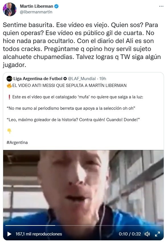 Tras la nueva viralización del fragmento, las críticas hacia Liberman volvieron a ser moneda corriente y el periodista decidió defenderse a través de Twitter de la manera más enfática posible. “Sentime basurita. Ese vídeo es viejo. Quien sos? Para quien operas? Ese vídeo es público gil de cuarta. No hice nada para ocultarlo”, citó el reconocido conductor con un mensaje directo a quien difundió su video.