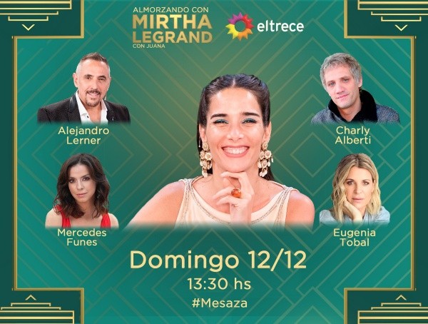 Un día más tarde, la nieta de Mirtha Legrand tendrá el honor de compartir la mesaza de Almorzando con Mirtha Legrand con Alejandro Lerner, Charly Alberti, Eugenia Tobal y Mercedes Funes.