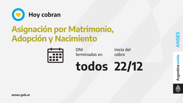 Desde hoy y hasta el 10 de enero se pagan las Asignaciones de Pago Único (Matrimonio, Adopción y Nacimiento) para todas las finalizaciones de documento.