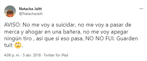 Cabe destacar que poco tiempo después de la muerte de la modelo, se volvió viral un tweet de ella en el2018donde avisaba lo siguiente: “AVISO: no me voy a suicidar, no me voy a pasar de merca y ahogar en una bañera, no me voy a pegar ningún tiro, asi que si eso pasa, NO FUI. Guarden tuit”.