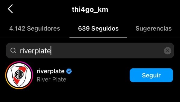 Por último, entre las cuentas seguidas, se puede observar que Thiago sigue a la cuenta oficial del Club Atlético River Plate.