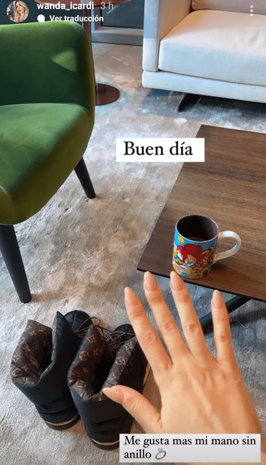 En las primeras horas de este lunes, Wanda publicó una historia en su cuenta oficial de Instagram con el clásico “Buen día” de cada lunes. En la parte inferior de la imagen apareció su mano con un detalle que no dejó pasar inadvertido. “Me gusta más mi mano sin anillo”, escribió Nara mostrando que no llevaba la joya de su casamiento. Todo dicho, señoras y señores.