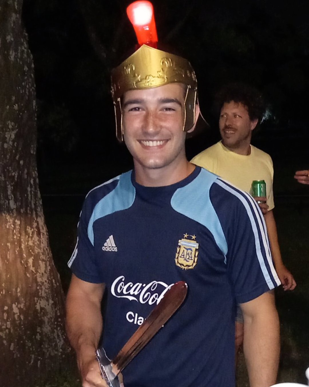 Entre otros hilarantes disfraces, otro muchacho apareció vestido de soldado espartano con la camiseta de Argentina, clara referencia al Leónidas de Pujato, también un grupo de amigos fue con un camión hecho de cartón que decía “La Scaloneta” con la cara del entrenador nacional.Que lindo país.
