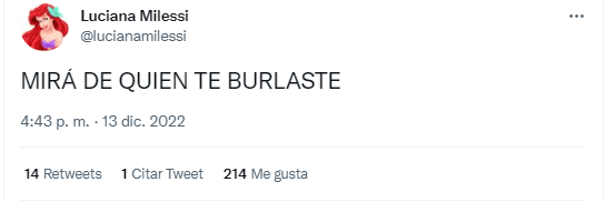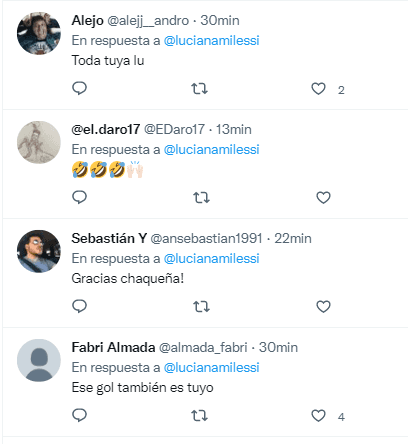 “Mirá de quién te burlaste”, posteó Milessi en su cuenta oficial de Twitter. Las respuestas al posteo se plagaron de agradecimientos por parte de los usuarios, ya que varios de ellos le adjudican parte del éxito de Álvarez desde que Luciana tomó relevancia en redes sociales. Una perlita en el Argentina-Croacia.