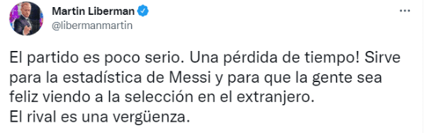 “El partido es poco serio. Una pérdida de tiempo! Sirve para la estadística de Messi y para que la gente sea feliz viendo a la selección en el extranjero. El rival es una vergüenza”, posteó el periodista en su cuenta oficial de Twitter en repudio del amistoso que se jugó en España y la reacción positiva de la gente tras la goleada.