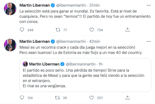 Los comentarios no tardaron en llegar a la publicación, en su mayoría críticas por la frialdad del análisis en medio de la alegría de los hinchas de la Selección Argentina. Luego, Liberman agregó un nuevo tuit sobre Messi:“Es un recontra crack y cada día juega mejor (en la selección). Pero sean buenos! Lo de Estonia es más flojo que un más 40 del country”. Sus palabras repercutieron en Twitter y la devolución de los usuarios fue negativa.