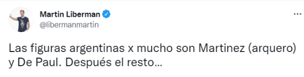 El experiodista de FOX Sports resaltó a quienes, para su criterio, son las figuras de la Selección. Sin embargo, una omisión hizo que el tuit se volviera polémico en cuestión de segundos. “Las figuras argentinas, pormucho, son Emiliano Martinezy De Paul. Después el resto…”, posteó Liberman en redes sociales. ¿Y Messi?