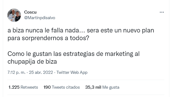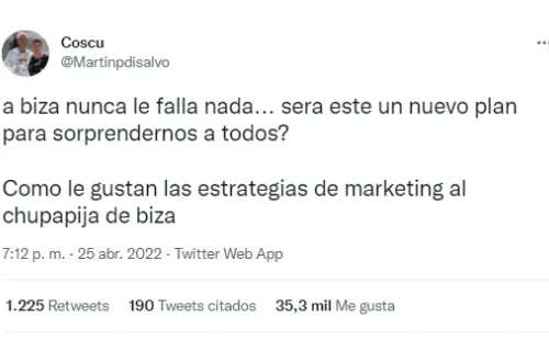“Abiza nunca le falla nada… sera este un nuevo plan para sorprendernos a todos? Como le gustan las estrategias de marketing al ch…… de biza”, escribió. ¿Será?