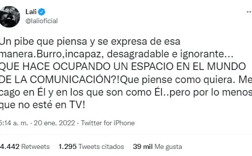 Lali Espósito, una de las cantantes más reconocidas de este parte del globo, salió también al cruce y liquidó al ex-miembro del Show del Fútbol en su cuenta de Twitter: “Un pibe que piensa y se expresa de esa manera. Burro,incapaz, desagradable e ignorante… ¿QUE HACE OCUPANDO UN ESPACIO EN EL MUNDO DE LA COMUNICACIÓN? Que piense como quiera. Me cago en Él y en los que son como Él… pero por lo menos que no esté en TV!”. ¡Duro!