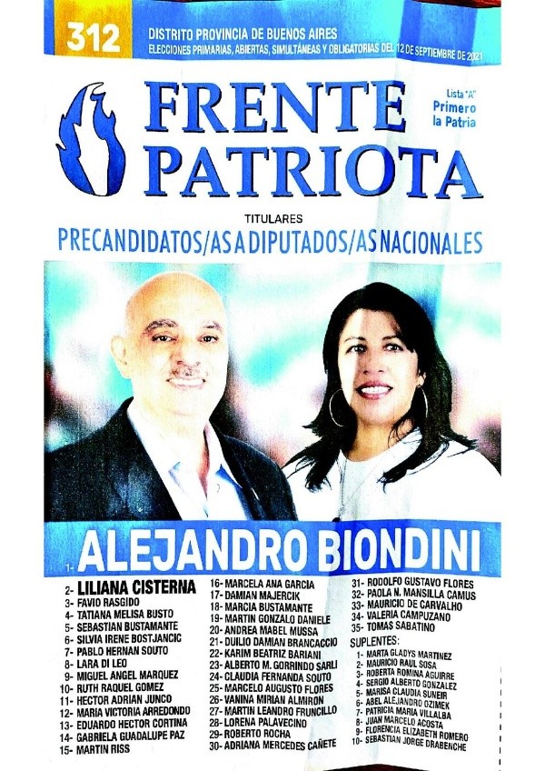 - Frente Patriota: Alejandro Biondini – Liliana Cisterna