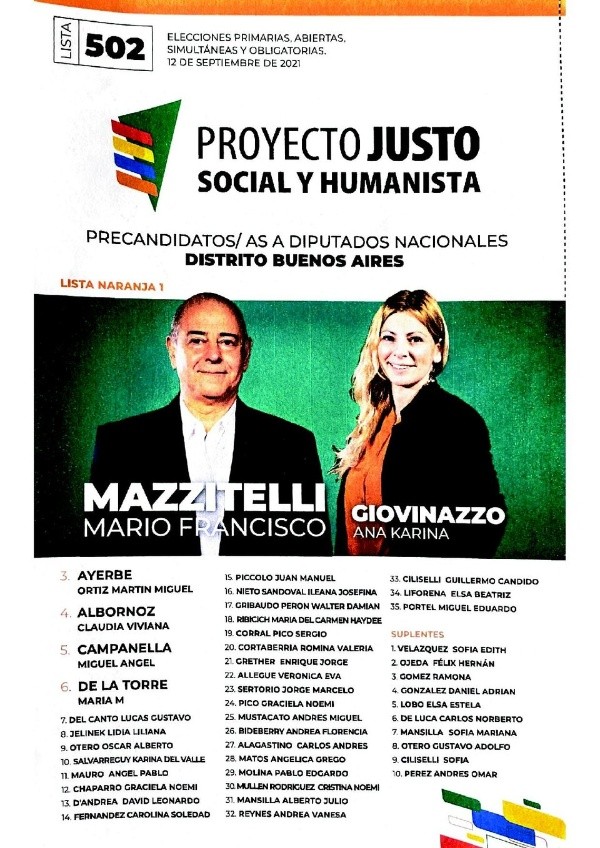 - Proyecto Justo Social y Humanista: Mario Mazzittelli – Ana Giovinazzo