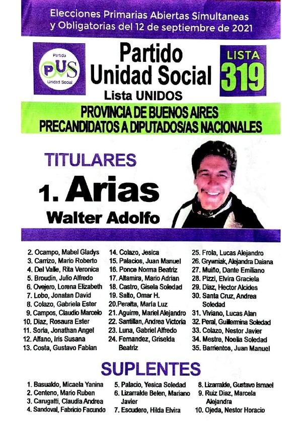 - Partido Unidad Social: Walter Arias – Mabel Ocampo