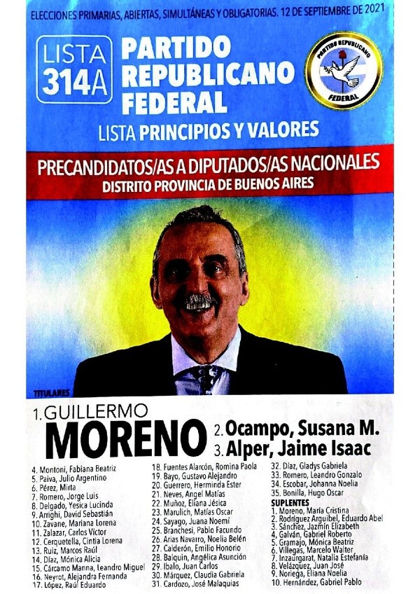 - Partido Republicano Federal: Guillermo Moreno – Susana Ocampo