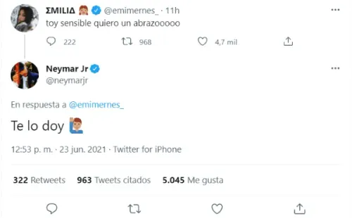 Pasa que la famosa cantante Emilia Mernes hace varias horar publicó: “Toy sensible quiero un abrazooooo”. Cuando lo vio, el jugador del Paris Saint Germain no tuvo problema en hacer pública su intención de cumplir con los deseos de ella: “Te lo doy”.